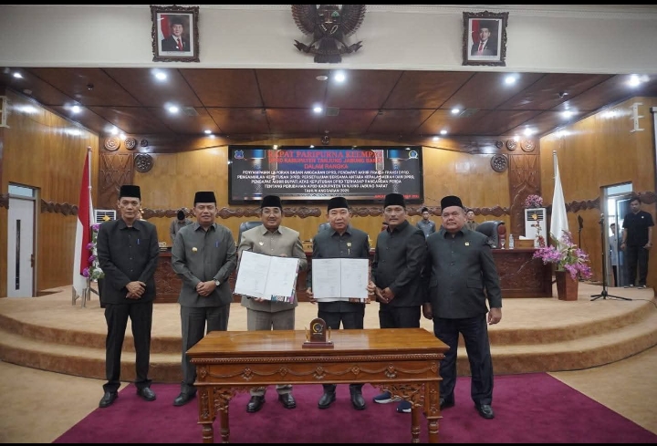 KUALA TUNGKAL, – DPRD Kabupaten Tanjung Jabung Barat (Tanjab Barat) bersama Pemerintah Kabupaten (Pemkab) Tanjab Barat resmi menandatangani Rancangan Peraturan Daerah (Ranperda) tentang Perubahan Anggaran Pendapatan dan Belanja Daerah (APBD) Tahun Anggaran 2025. Penandatanganan ini berlangsung dalam Rapat Paripurna keempat yang digelar di Gedung DPRD Tanjab Barat pada Jumat (12/9/2025).