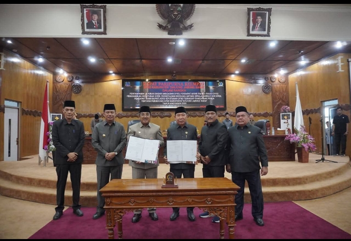 KUALA TUNGKAL, – DPRD Kabupaten Tanjung Jabung Barat (Tanjab Barat) bersama Pemerintah Kabupaten (Pemkab) Tanjab Barat resmi menandatangani Rancangan Peraturan Daerah (Ranperda) tentang Perubahan Anggaran Pendapatan dan Belanja Daerah (APBD) Tahun Anggaran 2025. Penandatanganan ini berlangsung dalam Rapat Paripurna keempat yang digelar di Gedung DPRD Tanjab Barat pada Jumat (12/9/2025).