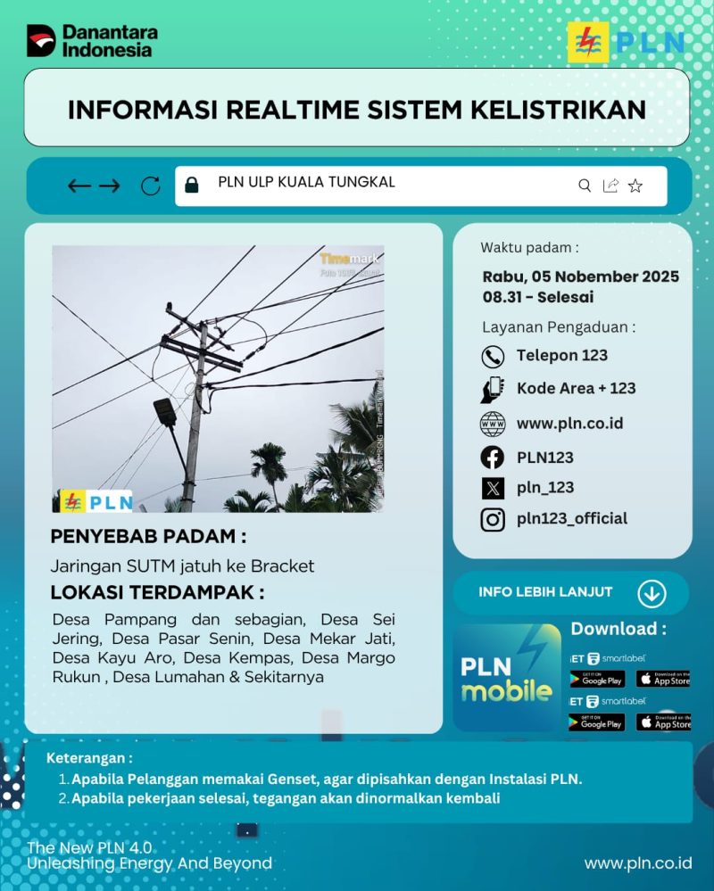 Gangguan terjadi pada Rabu, 5 November 2025, pukul 08.31. Tim teknik PLN ULP Kuala Tungkal langsung diterjunkan ke lokasi untuk mengidentifikasi dan memperbaiki masalah.