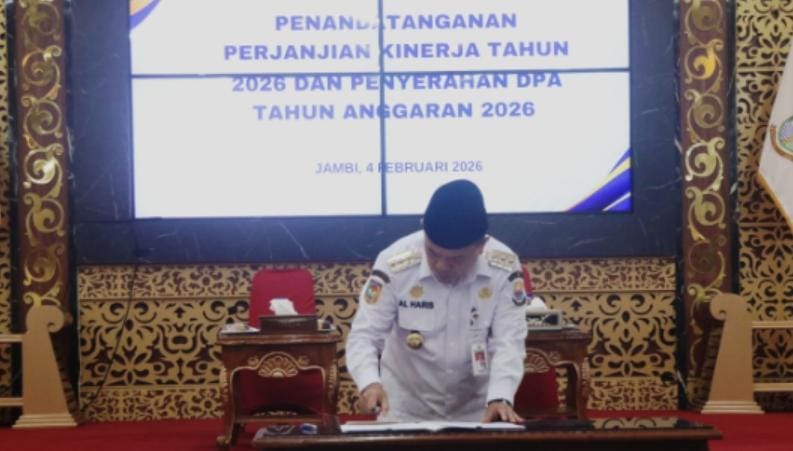 JAMBI – Gubernur Jambi Dr. H. Al Haris, S.Sos., MH menegaskan pentingnya komitmen kerja yang terukur, fokus, dan dapat dipertanggungjawabkan dalam penyelenggaraan pemerintahan melalui Penandatanganan Perjanjian Kinerja Tahun 2026 yang dirangkaikan dengan Penyerahan Dokumen Pelaksanaan Anggaran (DPA) Tahun Anggaran 2026, bertempat di Ruang Pola Kantor Gubernur Jambi, Senin (04/02/2026) siang.
