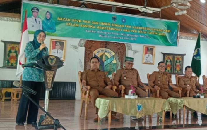 Ketua TP PKK Kabupaten Batang Hari Bunda Zuva Fadhil menyampaikan, kegiatan Bazar yang dilaksanakan untuk melatih Ibuk-ibuk kader untuk lebih berani dalam pemasaran dan manajemen usaha, yang dihadiri para Kepala OPD dan undangan lainnya, untuk memperkenalkan produk UMKM anggota PKK.
